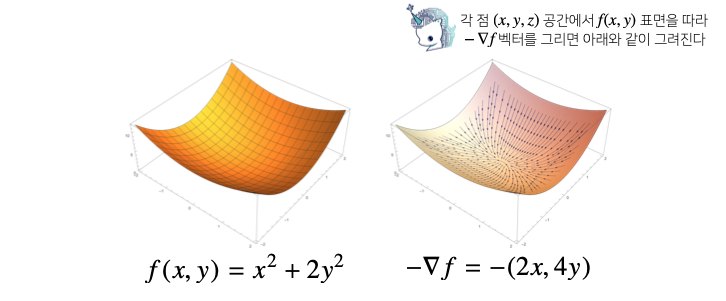 각 변수 별로 편미분을 계산한 그레디언트 벡터를 이용하여 경사하강/경사상승법에 사용할 수 있다.