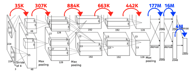 224x224x3 이미지가 input으로 들어왔을 때, 11x11x3 (필터의 channel은 인풋과 일치해야 함) 필터로 Convolution 연산을 진행하면 11*11*3*48*2 개의 파라미터, 즉 첫 번째 35k만큼의 파라미터를 요구하게 된다. 조금 더 자세하게 설명하자면