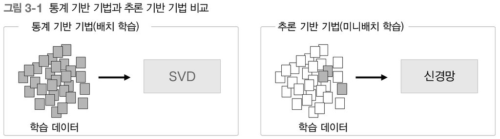 통계 기반 기법은 말뭉치 전체의 통계(동시발생 행렬과 PPMI 등)를 이용해 단 1회의 처리(SVD 등) 만에 단어의 분산 표현을 얻는다. 한편, 추론 기반 기법에서는, 예컨대 신경망을 이용하는 경우는 미니 배치로 학습하는 것이 일반적이다.
